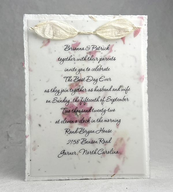 Each Invitation Kit contains: 25 torn-to-size invitations of our handmade seeded paper, 25 cut-to-size printer safe clear vellum pieces, 25 recycled invitation envelopes, eco-twist ribbon, punching template and online assembly instructions. Some styles contain twist to wrap around the outside. Eco-twist colors are interchangable.