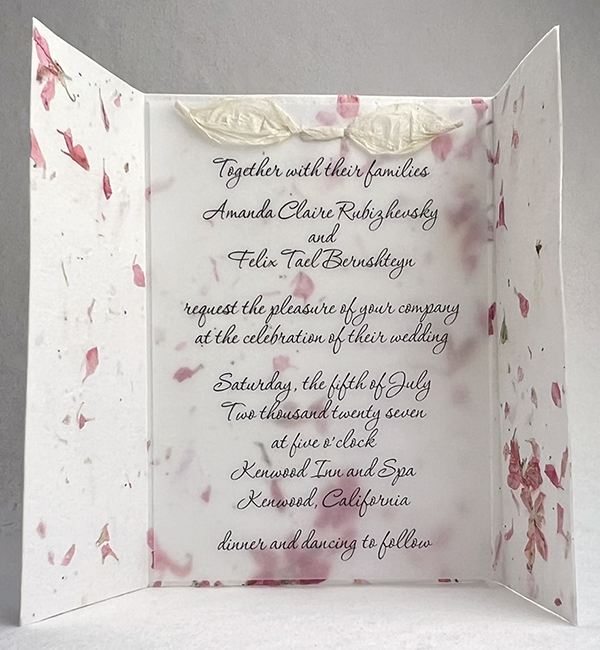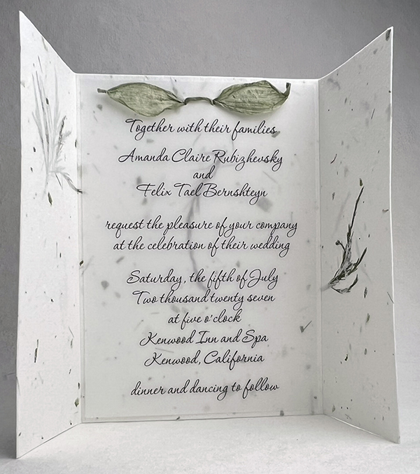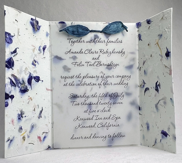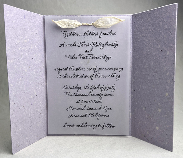 Each Invitation Kit contains: 25 cut-to-size invitations of our handmade seeded paper, 25 cut-to-size printer safe clear vellum pieces, 25 recycled invitation envelopes, eco-twist ribbon, punching template, folding template and online assembly instructions. Some styles contain twist to wrap around the outside. Eco-twist colors are interchangable. This measures 5x7 when folded.