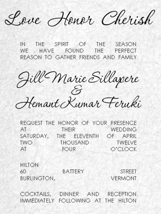 Erin Marie Wallace and Robin Sarah Watts request the pleasure of your company at the blessing and celebration of their wedding Saturday, the twenty-second of April Two thousand twelve at four o’clock Sacred Heart Church Albany, New York |