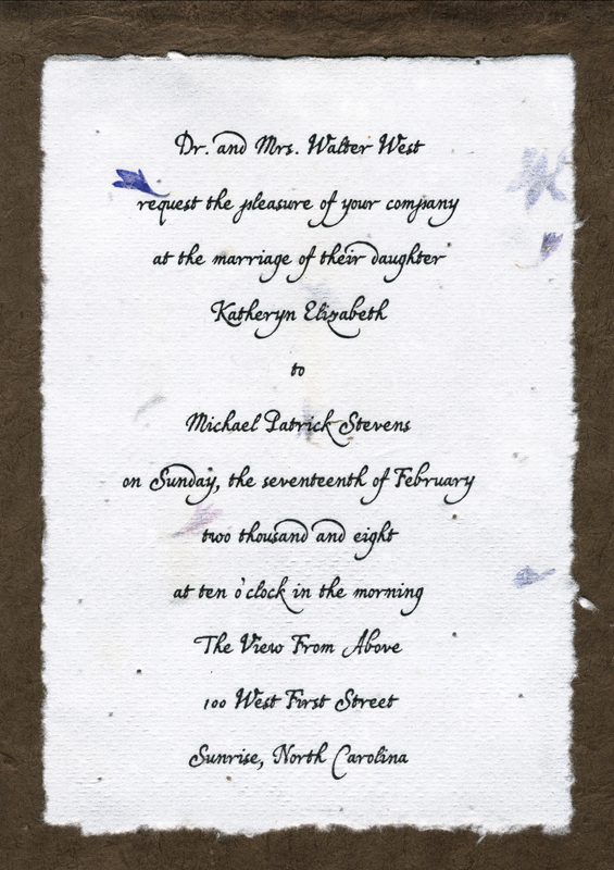 This uses your choice of custom paper mounted on seeded, vegetable dyed lotka paper, which comes in four colors. This combination is very earth friendly, they are both plantable papers which sprout into wildflowers.