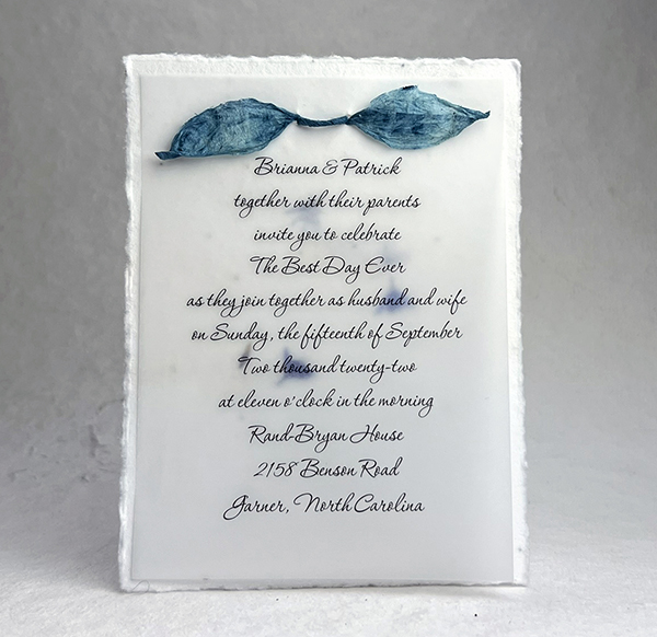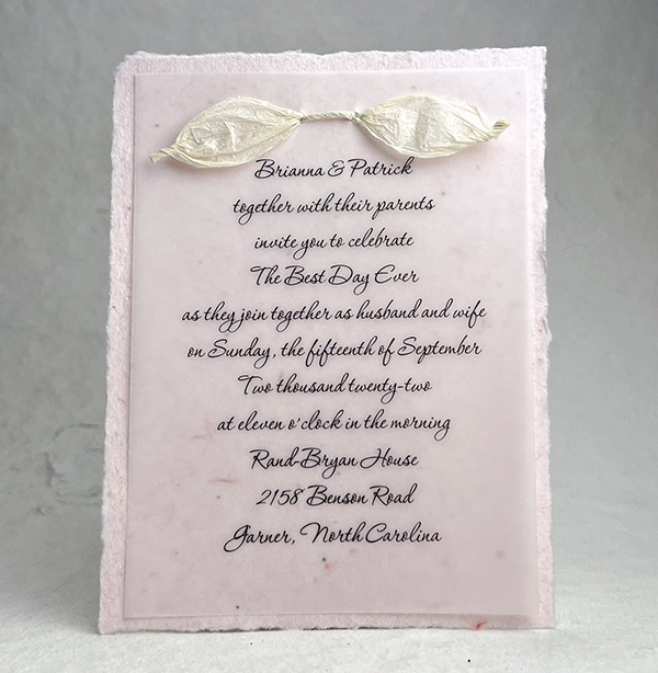 Each Invitation Kit contains: 25 torn-to-size invitations of our handmade seeded paper, 25 cut-to-size printer safe clear vellum pieces, 25 recycled invitation envelopes, eco-twist ribbon, punching template and online assembly instructions. Some styles contain twist to wrap around the outside. Eco-twist colors are interchangable.