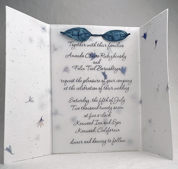 Each Invitation Kit contains: 25 cut-to-size invitations of our handmade seeded paper, 25 cut-to-size printer safe clear vellum pieces, 25 recycled invitation envelopes, eco-twist ribbon, punching template, folding template and online assembly instructions. Some styles contain twist to wrap around the outside. Eco-twist colors are interchangable. This measures 5x7 when folded.