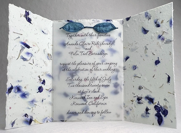 Each Invitation Kit contains: 25 torn-to-size invitations of our handmade seeded paper, 25 cut-to-size printer safe clear vellum pieces, 25 recycled invitation envelopes, eco-twist ribbon, punching template, folding template and online assembly instructions. Some styles contain twist to wrap around the outside. Eco-twist colors are interchangable. This measures 5x7 when folded.