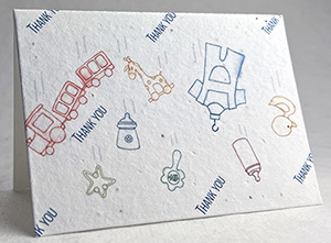 Our handmade papers are formed one at a time with a mould and deckle. They are made with 100% post industrial waste and are 100% tree free, acid free paper. Embedded in this stock is our unique North American Wildflower seed blend. The seeds will need four hours a day of direct sunlight with constant watering until established. The plants can grow to as tall as three feet. The seeds include Snapdragon (annual), Petunia (annual), Beardtongue (perennial), Poppy (annual), Mountain Mint (perennial), Chamomile (perennial). This blend is specifically designed to allow us to print directly onto the handmade seed paper and for safe propagation across North America.