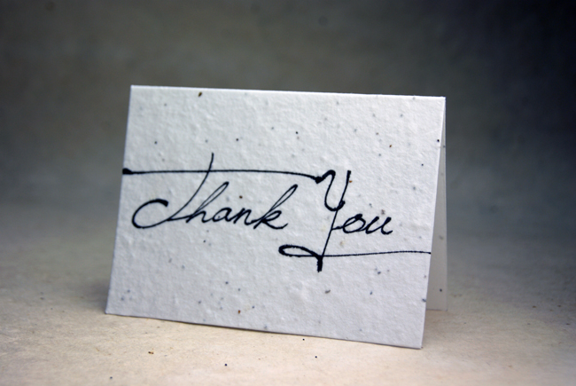 "Thank you" is printed in a handwriting font that bleeds to the edge of the card. Printed on paper with wildflower seeds.