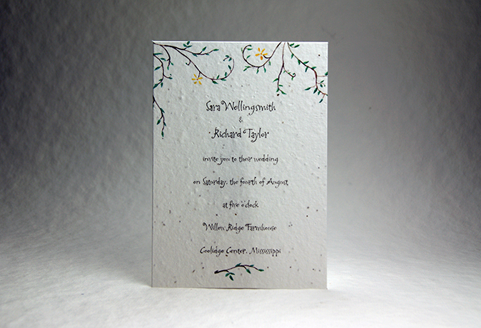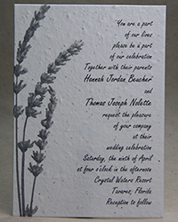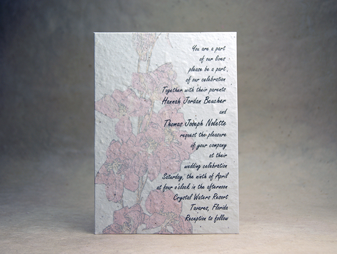 Pictured below are 5" x 7" panel invitations. We offer them on a cotton paper that is embedded with wildflower seeds and made in Seattle. We offer a variety of art in the background of the panels to complement your text. We also offer the option to duplex the invitation, doubling the thickness, to give it a solid elegance.
