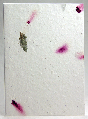 These sheets of sturdy handmade paper are formed one at a time with a mould and deckle. They are made with 100% post industrial waste and are 100% tree free, acid free paper. Embedded in this stock is our unique North American Wildflower seed blend. The seeds will need four hours a day of direct sunlight with constant watering until established. The plants can grow to as tall as three feet. The seeds include Snapdragon (annual), Petunia (annual), Beardtongue (perennial), Poppy (annual), Mountain Mint (perennial), Chamomile (perennial). This blend is specifically designed to allow us to print directly onto the handmade seed paper and for safe propagation across North America.