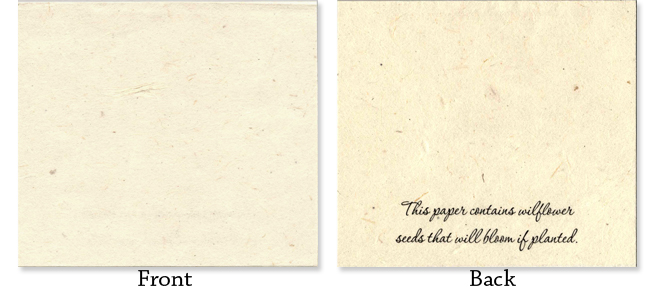 Our handmade papers are formed one at a time with a mould and deckle. They are made with 100% post industrial waste and are 100% tree free, acid free paper. Embedded in this stock is our unique North American Wildflower seed blend. The seeds will need four hours a day of direct sunlight with constant watering until established. The plants can grow to as tall as three feet. The seeds include Snapdragon (annual), Petunia (annual), Beardtongue (perennial), Poppy (annual), Mountain Mint (perennial), Chamomile (perennial). This blend is specifically designed to allow us to print directly onto the handmade seed paper and for safe propagation across North America.