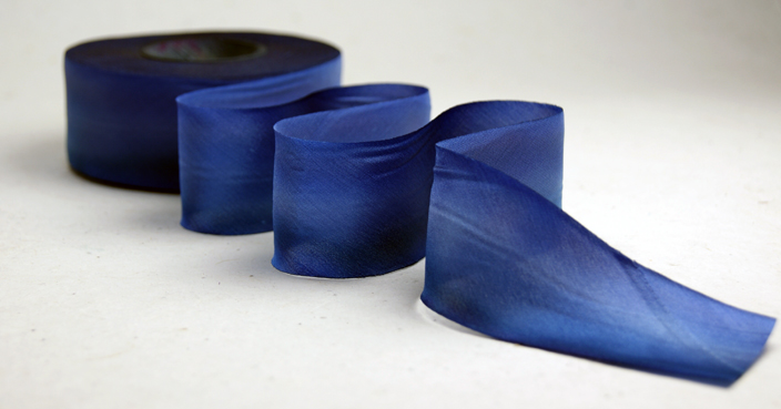 In conventional dyeing the thread is first dyed in a vat and then loaded onto a loom where the strands are woven together to form the ribbon. In our hand dyeing method all of the action happens while the bias cut spool is tightly wrapped, and that pressure influences where and how the dye is absorbed. We hope you enjoy our ribbons as much as we like making them! There are over 150 colors in our line and we continue to add more as our customers continue to bring custom requests. Contact us with yours!