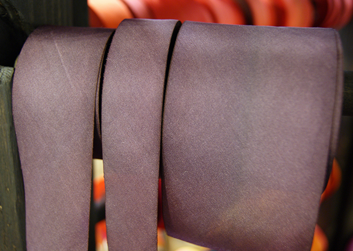 In conventional dyeing the thread is first dyed in a vat and then loaded onto a loom where the strands are woven together to form the ribbon. In our hand dyeing method all of the action happens while the bias cut spool is tightly wrapped, and that pressure influences where and how the dye is absorbed. We hope you enjoy our ribbons as much as we like making them! There are over 150 colors in our line and we continue to add more as our customers continue to bring custom requests. Contact us with yours!