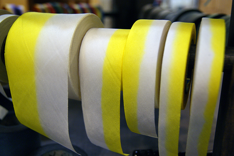 In conventional dyeing the thread is first dyed in a vat and then loaded onto a loom where the strands are woven together to form the ribbon. In our hand dyeing method all of the action happens while the bias cut spool is tightly wrapped, and that pressure influences where and how the dye is absorbed. We hope you enjoy our ribbons as much as we like making them! There are over 150 colors in our line and we continue to add more as our customers continue to bring custom requests. Contact us with yours!