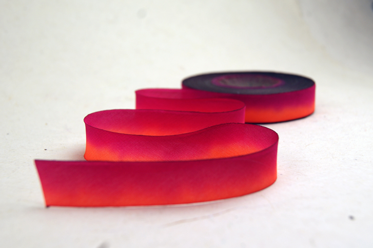 In conventional dyeing the thread is first dyed in a vat and then loaded onto a loom where the strands are woven together to form the ribbon. In our hand dyeing method all of the action happens while the bias cut spool is tightly wrapped, and that pressure influences where and how the dye is absorbed. We hope you enjoy our ribbons as much as we like making them! There are over 150 colors in our line and we continue to add more as our customers continue to bring custom requests. Contact us with yours!