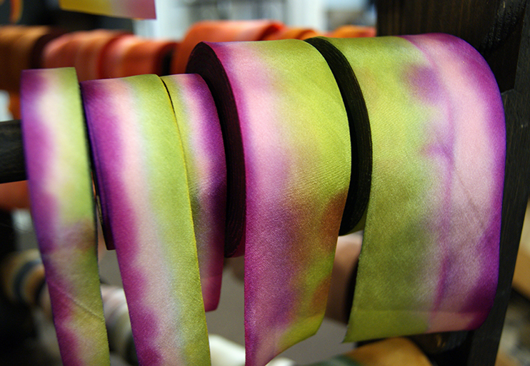In conventional dyeing the thread is first dyed in a vat and then loaded onto a loom where the strands are woven together to form the ribbon. In our hand dyeing method all of the action happens while the bias cut spool is tightly wrapped, and that pressure influences where and how the dye is absorbed. We hope you enjoy our ribbons as much as we like making them! There are over 150 colors in our line and we continue to add more as our customers continue to bring custom requests. Contact us with yours!