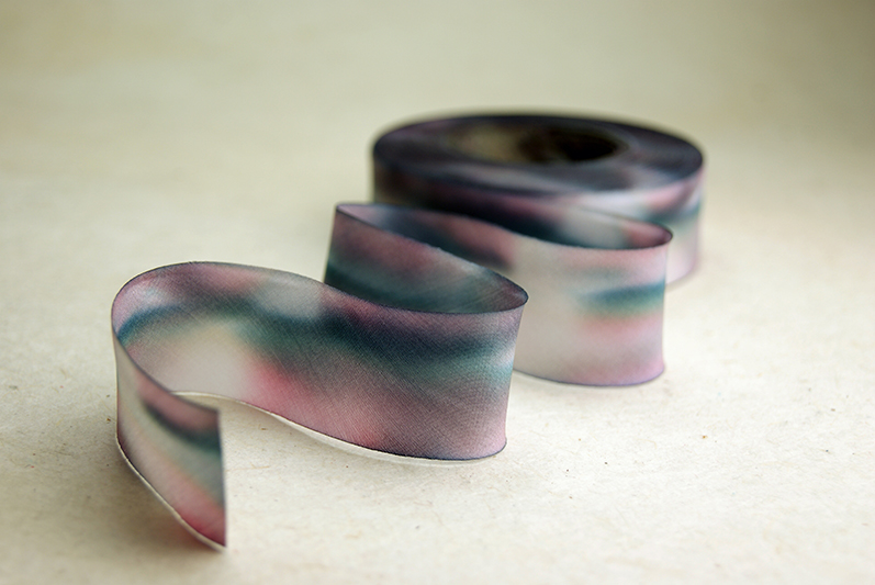 These Earth Silk spools are made by hand in our Seattle studio. Our hand dipped dyeing process produces a unique look with subtle qualities that cannot be found in traditional ribbon dyeing. Our process creates almost zero waste and generates a stunning work of art.