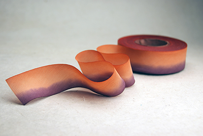 These Earth Silk spools are made by hand in our Seattle studio. Our hand dipped dyeing process produces a unique look with subtle qualities that cannot be found in traditional ribbon dyeing. Our process creates almost zero waste and generates a stunning work of art.
