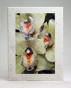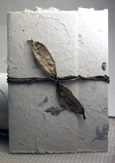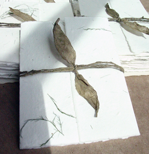 We use two main fibers for our paper at Of The Earth. One we call Lotka paper and it is made from the bark of the Daphne bush. It is a naturally regenerating renewable resource. All lotka envelopes and paper are 100% tree free and 50% recycled. The paper is also acid free and your purchase will benefit the economic enterprise of rural craftspeople in Nepal. Some of the lotka papers are embedded with seeds and will bloom if planted. We also make a cotton and abaca blend paper in our Seattle studio. This tree free earth friendly paper is made with every effort to conserve water and resources. We add no chemicals or other agents to ensure that our process is as environmentally friendly as possible. We are happy to offer 100% post industrial waste recycled handmade papers as well.