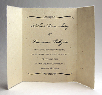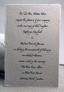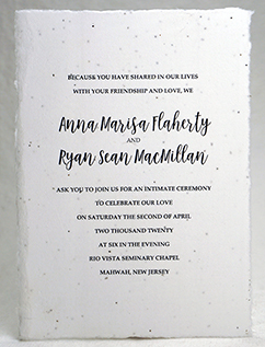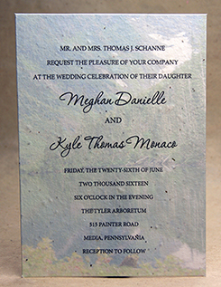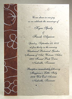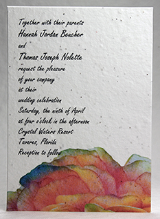 We can print your text directly on handmade paper. Overlay style invitations can be printed at home, or we can print them for you. Papers can be custom made or selected from our available Handmade Paper stock. Invitations can be simple flat panels, or more decorative with ribbons, pressed flowers, stickers, or botanicals.